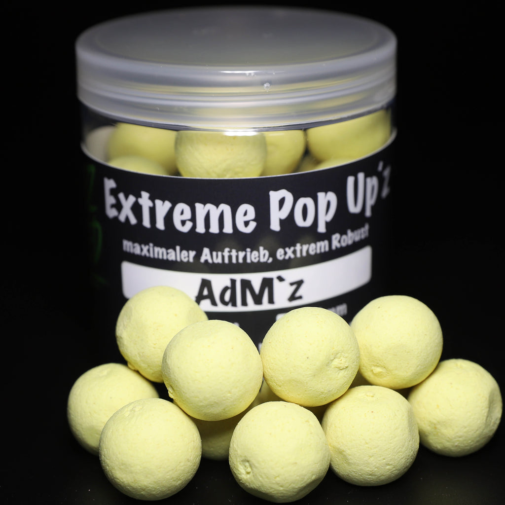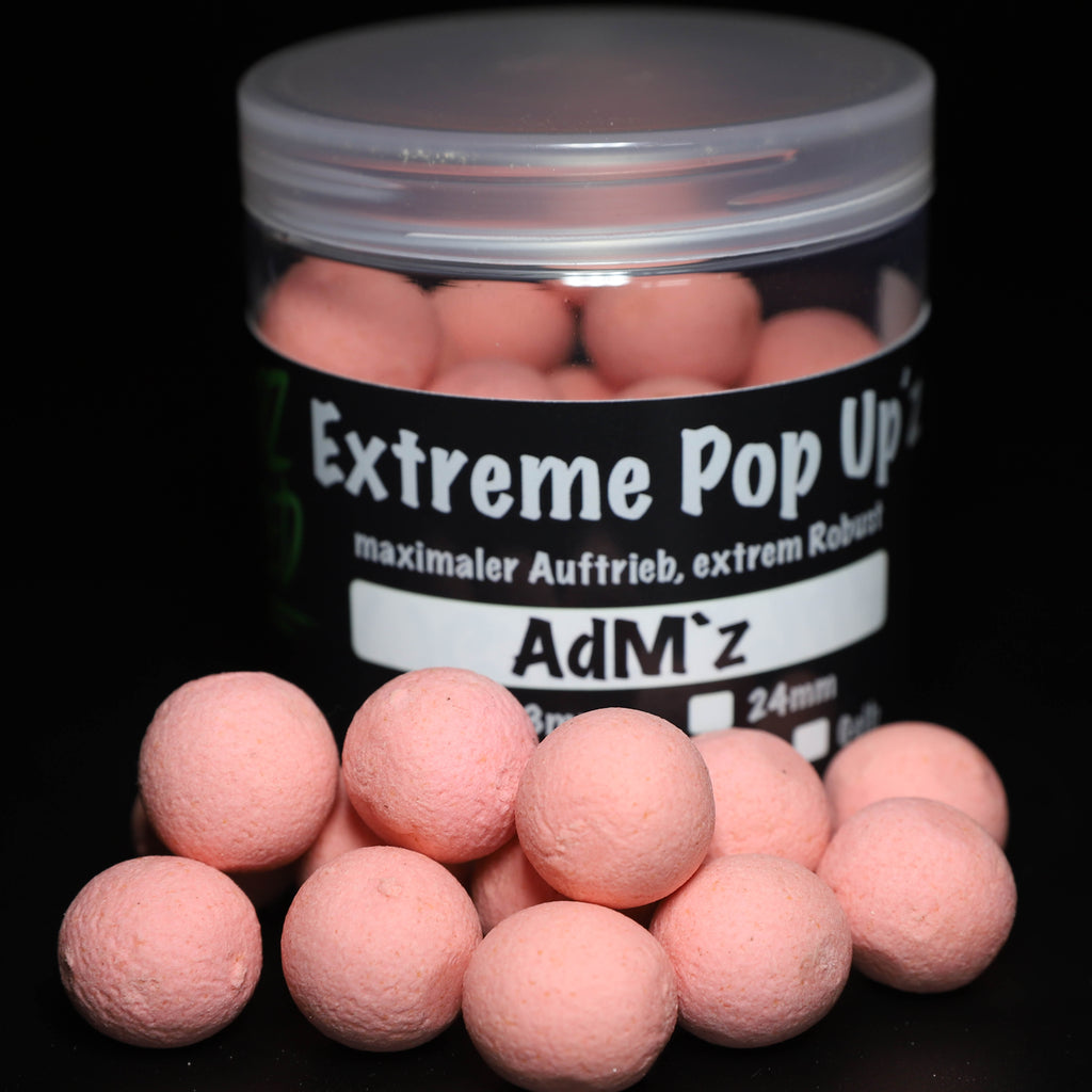 - Attraktivität - wir wollten keine schwimmende Gummikugel produzieren, sondern einen auffälligen schwimmenden Boilie der auch wie einer arbeitet. Daher haben wir unseren Pop Up´z Zutaten wie z. B. Fischprotein, Betain und Buttersäure zugefügt. Zusätzlich werden die Pop Up´z beim Trocknen 2 mal mit unserem AdM´z Flavour nachbehandelt.